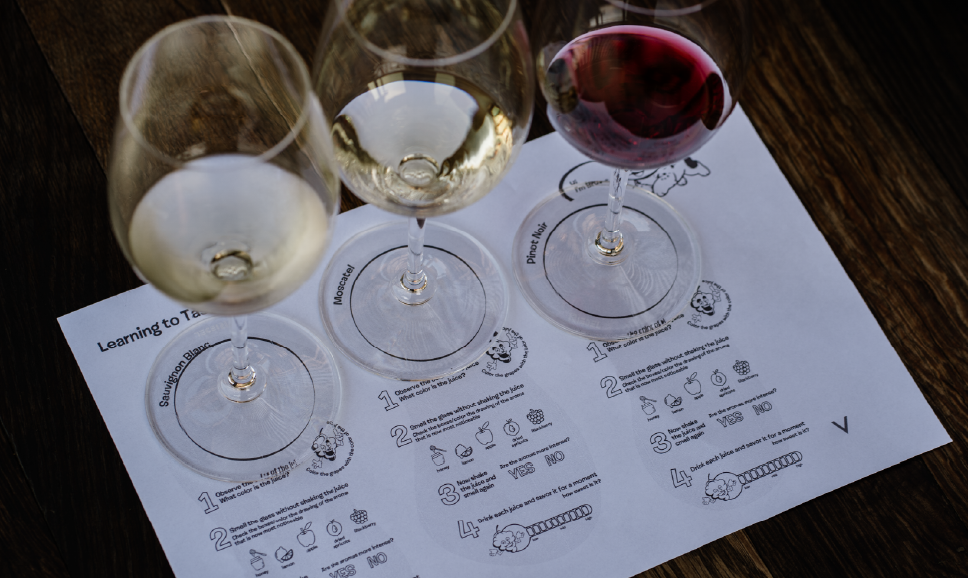 Degustación de tres jugos de uva con individual de cata temático para pintar.